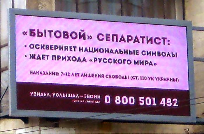El segundo cartel es el buzoneo a gran escala por toda Ucrania invitando a la gente a delatar y denunciar rusófonos. Puede traducirlo usted mismo. La Rada ha aprobado una ley que permite internar a rusófonos en campos de concentración (tal cual) tan pronto comiencen de nuevo las hostias, para el verano se espera, porque los únicos que están metiendo armas en Ucrania son los americanos y sus amiwitos los británicos (con Israel por el medio).