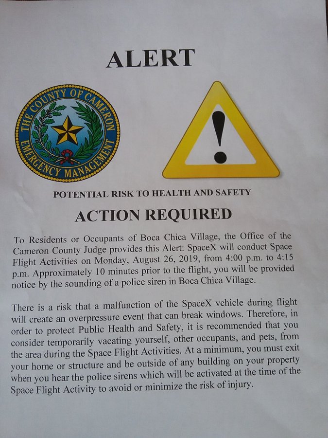 Por fin le dieron permiso al Starhopper para su segunda y ULTIMA prueba. La FAA tiene miedo que explote y se cargue la vecindad. Hay un pequeño caserio a 2,4 km (Boca Chica Village). La FAA recomendo a la gente que *se vaya* de sus casas junto con sus mascotas en ese momento (hoy, 26 de Agosto, 4 pm hora local).