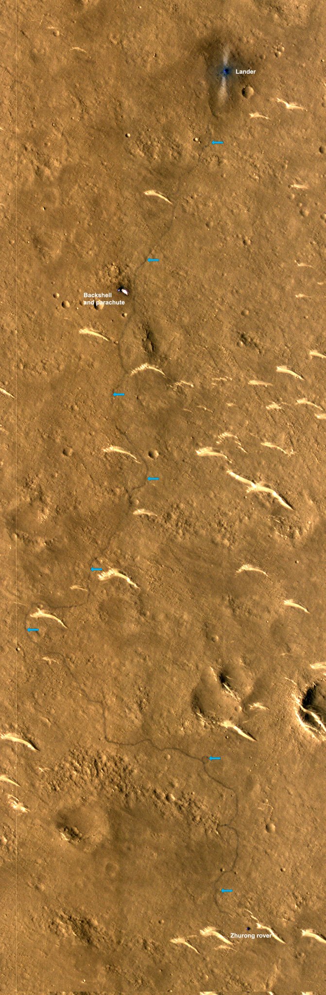 Gracias a las imágenes de la Tianwen 1, se continúan poniendo nombres en chino a varias características del terreno marciano. Por ejemplo, tenemos esta lista de 22 zonas aprobadas por la Unión Astronómica Internacional. Precisamente, el rover Zhurong (祝融号) sigue adelante en su odisea particular en Utopia Planitia. En la siguiente imagen de la HiRIC vemos las huellas que ha dejado en su recorrido hacia el sur: