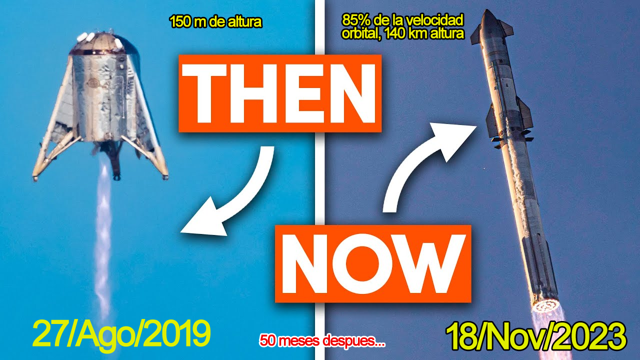 Recordatorio grafico: de Starhopper a IFT-2, del primer salto de 150 m de la cafetera al 85% de la velocidad orbital: 50 meses.